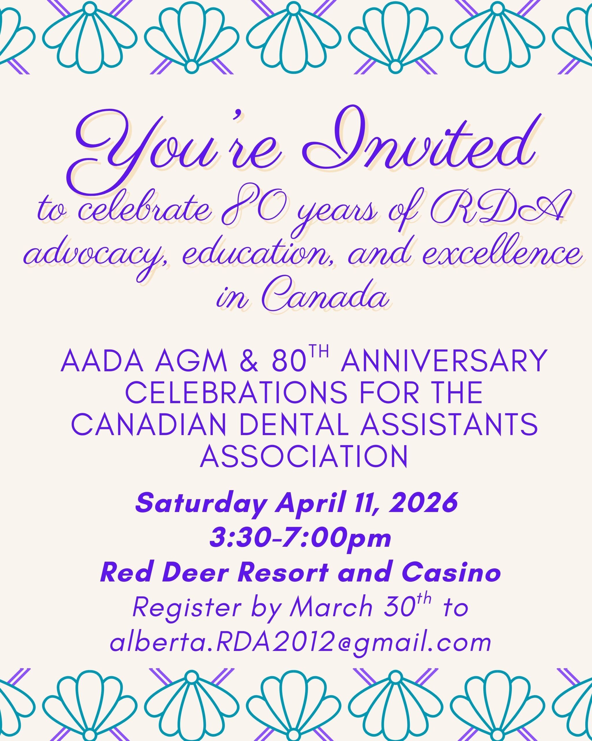 Please contact the hosting organization directly to confirm any meeting or event you are planning to attend to confirm locations and dates/times which are subject to change. To add or change any information included in the Calendar please contact the AADA office by email to alberta.rda2012@gmail.com